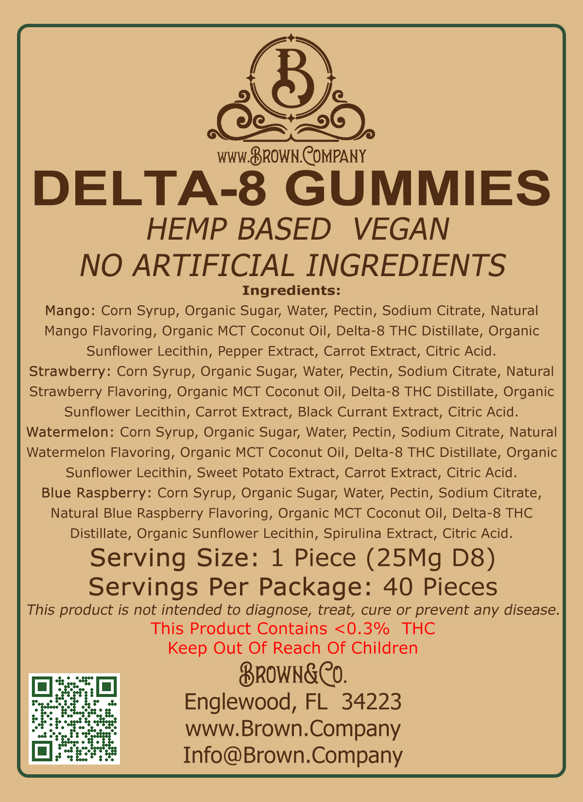 Mango: Corn Syrup, Organic Sugar, Water, Pectin, Sodium Citrate, Natural Mango Flavoring, Organic MCT Coconut Oil, Delta-8 THC Distillate, Organic Sunflower Lecithin, Pepper Extract, Carrot Extract, Citric Acid.
